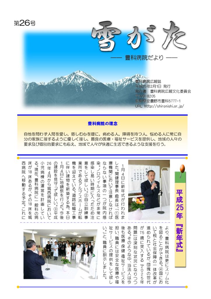 広報誌「雪がた – 豊科病院だより -」第26号を更新しました。(平成25年2月1日) 2013.02.01 広報誌「雪がた – 豊科病院だより -」第25号を更新しました。(平成24年11月10日)広報誌「雪がた – 豊科病院だより -」第27号を更新しました。(平成25年6月28日)