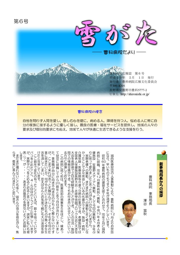 広報誌「雪がた – 豊科病院だより -」第06号を更新しました。(平成19年5月1日) 2007.05.01 広報誌「雪がた – 豊科病院だより -」第05号を更新しました。(平成19年2月1日)広報誌「雪がた – 豊科病院だより -」第07号を更新しました。(平成19年8月1日)