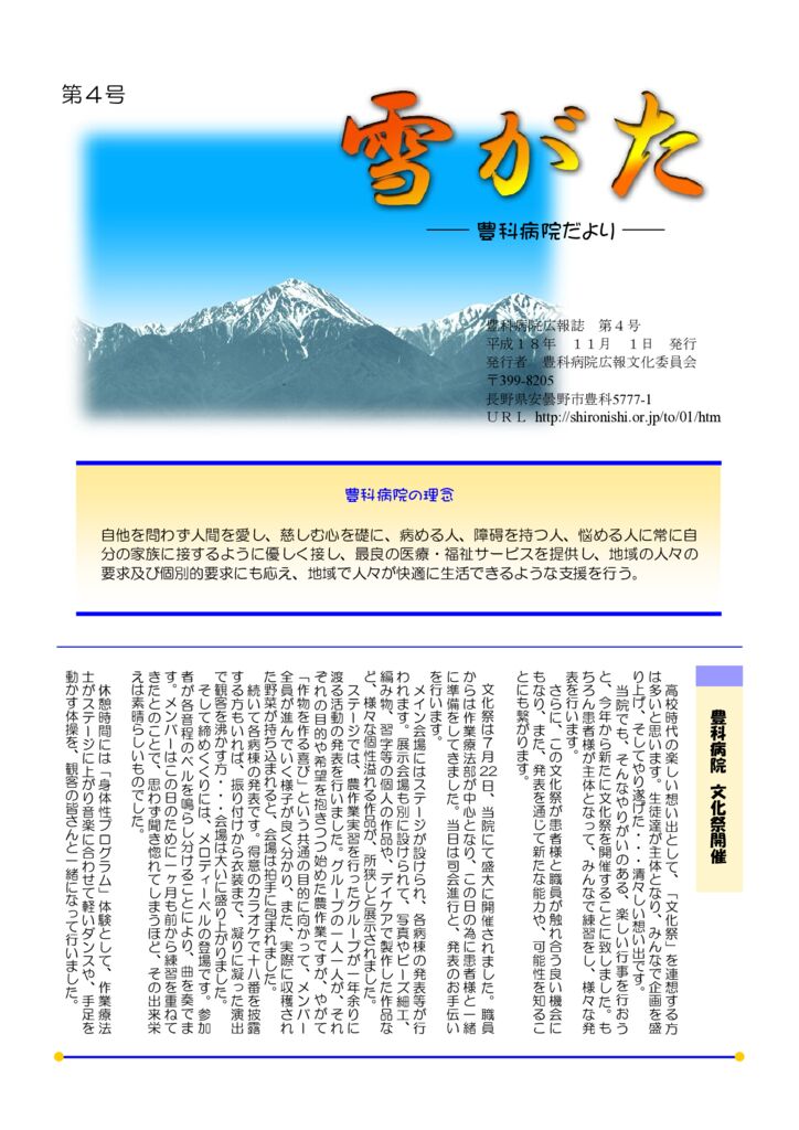 広報誌「雪がた – 豊科病院だより -」第04号を更新しました。(平成18年11月1日) 2006.11.01 広報誌「雪がた – 豊科病院だより -」第03号を更新しました。(平成18年2月1日)広報誌「雪がた – 豊科病院だより -」第05号を更新しました。(平成19年2月1日)