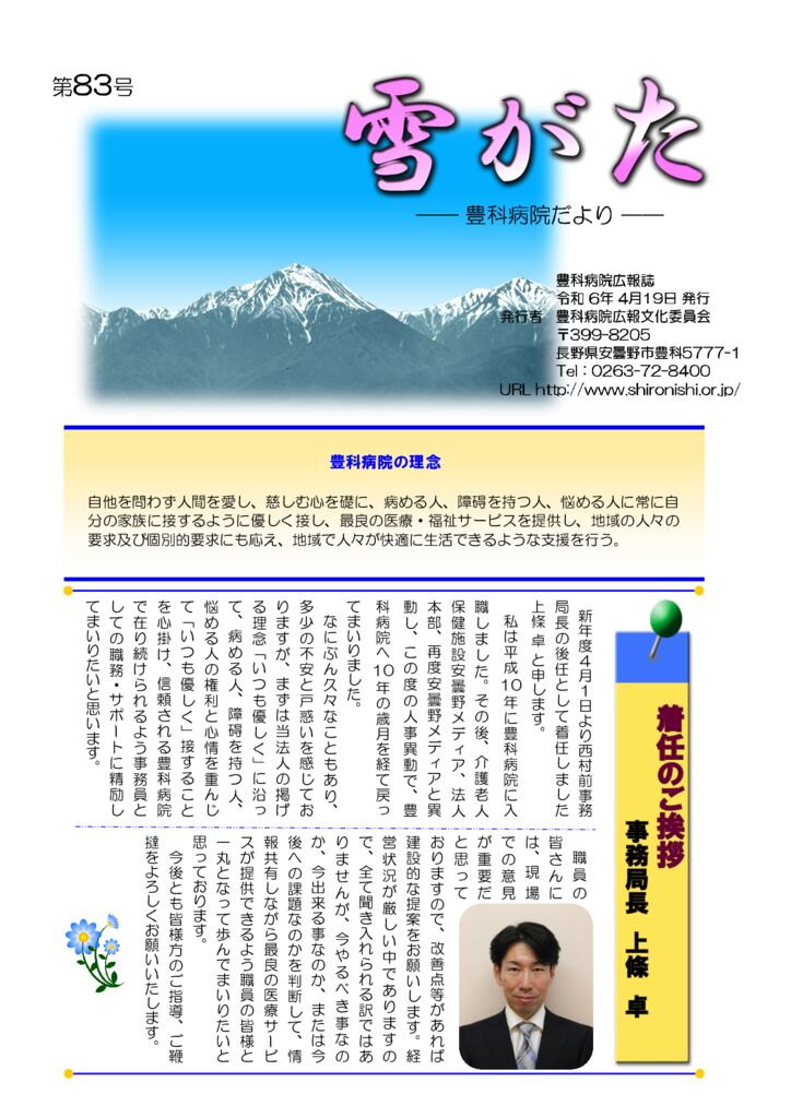 広報誌「雪がた – 豊科病院だより -」第83号を更新しました。(令和6年4月19日) 2024.04.19 広報誌「雪がた – 豊科病院だより -」第82号を更新しました。(令和6年2月3日)24/05/01より外来担当が変更となります
