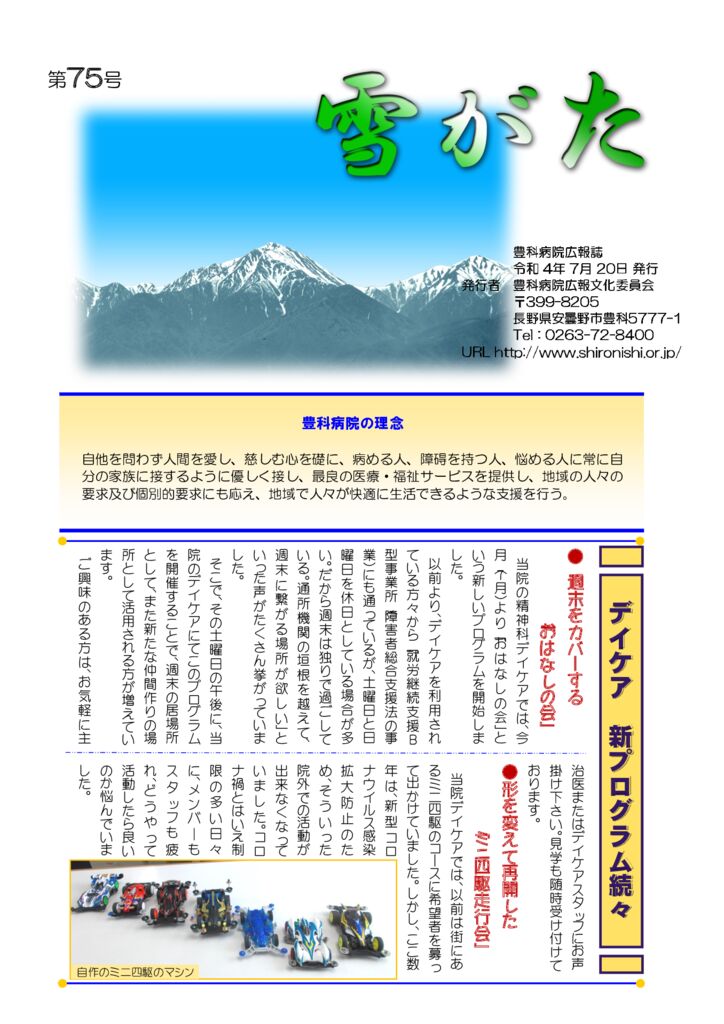 広報誌「雪がた – 豊科病院だより -」第75号を更新しました。(令和4年7月20日) 2022.07.20 広報誌「雪がた – 豊科病院だより -」第74号を更新しました。(令和4年5月2日)広報誌「雪がた – 豊科病院だより -」第76号を更新しました。(令和4年9月30日)