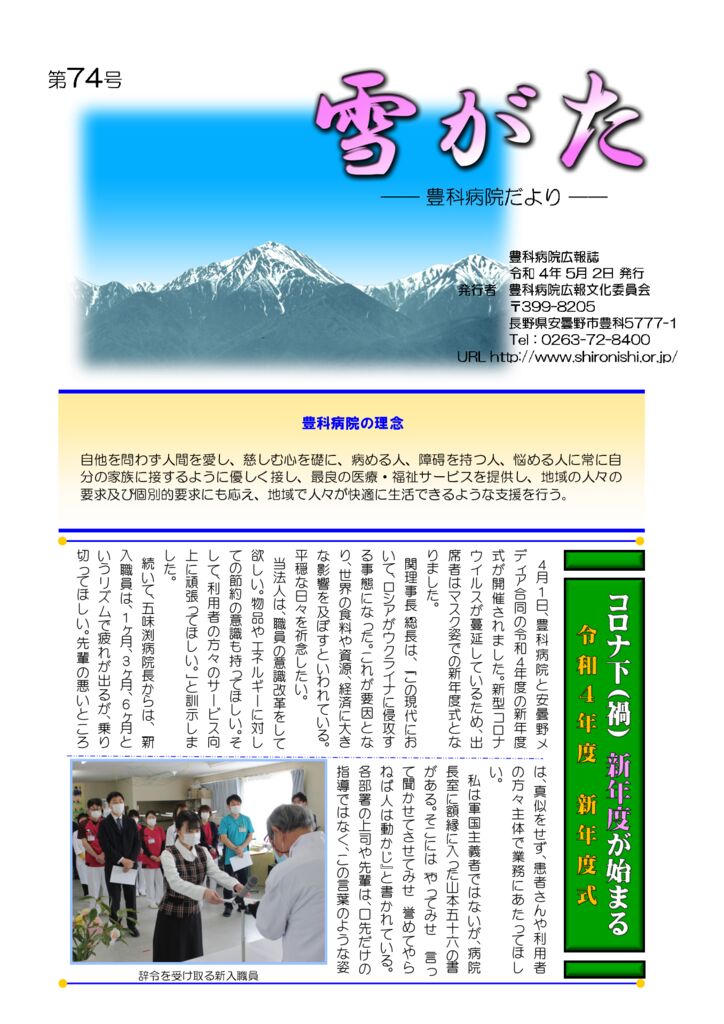 広報誌「雪がた – 豊科病院だより -」第74号を更新しました。(令和4年5月2日) 2022.05.02 広報誌「雪がた – 豊科病院だより -」第73号を更新しました。(令和4年2月28日)広報誌「雪がた – 豊科病院だより -」第75号を更新しました。(令和4年7月20日)