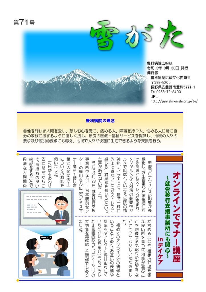 広報誌「雪がた – 豊科病院だより -」第71号を更新しました。(令和3年8月30日) 2021.08.30 広報誌「雪がた – 豊科病院だより -」第70号を更新しました。(令和3年5月20日)広報誌「雪がた – 豊科病院だより -」第72号を更新しました。(令和3年11月17日)