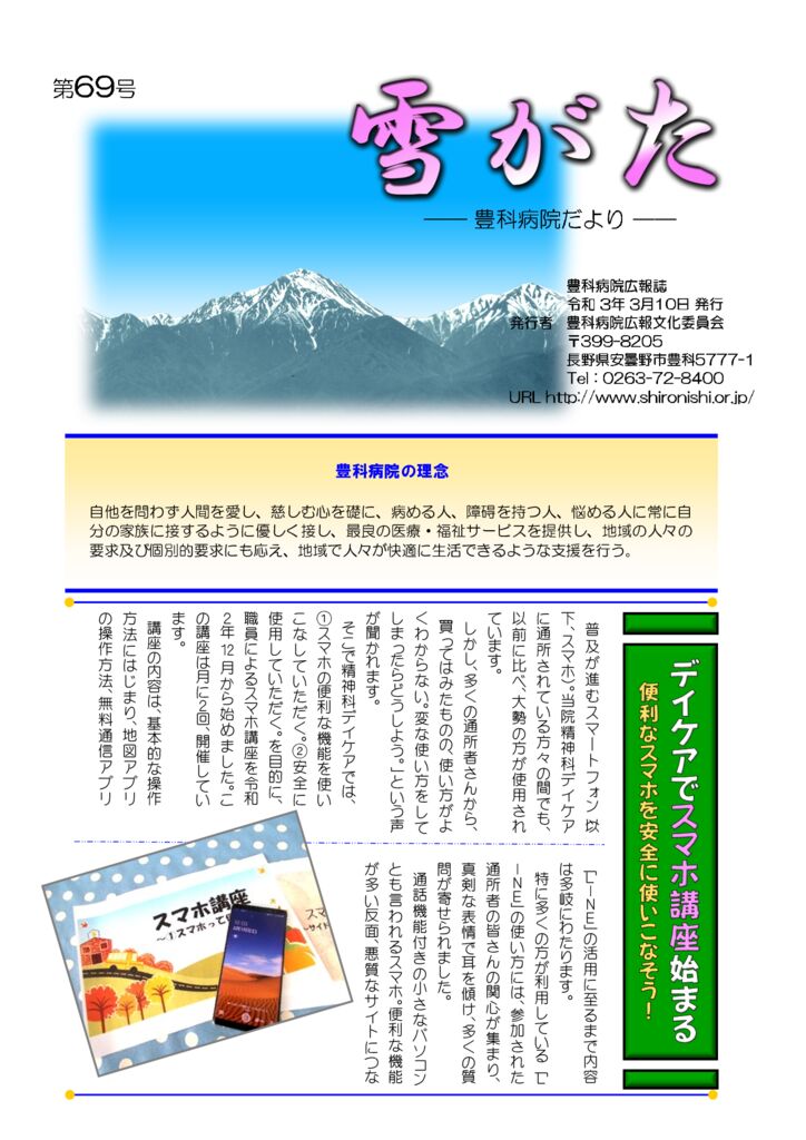 広報誌「雪がた – 豊科病院だより -」第69号を更新しました。(令和3年3月10日) 2021.03.10 広報誌「雪がた – 豊科病院だより -」第68号を更新しました。(令和2年12月5日)広報誌「雪がた – 豊科病院だより -」第70号を更新しました。(令和3年5月20日)