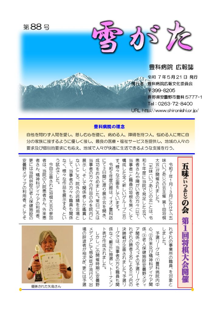 広報誌「雪がた – 豊科病院だより -」第88号を発行しました。(令和7年5月21日) 2025.05.29 広報誌「雪がた – 豊科病院だより -」第87号を発行しました。(令和7年2月10日)広報誌「雪がた – 豊科病院だより -」第89号を発行しました。(令和7年8月25日)
